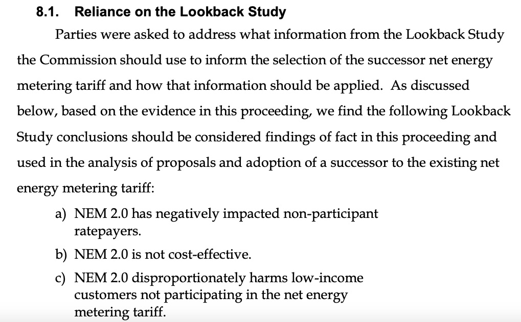 “We find the Lookback Study to be a sound analysis of the NEM 2.0 tariff and that it should be used in the development of a successor tariff. CALSSA and SEIA/Vote Solar would have the Commission dismiss the study because it is ‘backward-looking.’ The evaluation of the NEM 2.0 tariff tells us whether the tariff is or is not performing as required, thus establishing a foundation for creating the successor tariff. We recognize, as SEIA/Vote Solar states, that the study does not tell the complete story. However, the Lookback Study can inform us of what not to do. Furthermore, CALSSA’s contention that the study’ assumptions are or appear flawed’ does not persuade us; CALSSA and all stakeholders have been given several opportunities to weigh in on the development and drafting of the study. A disagreement on an assumption does not equate to a flaw in the assumption,” the CPUC’s proposal read.