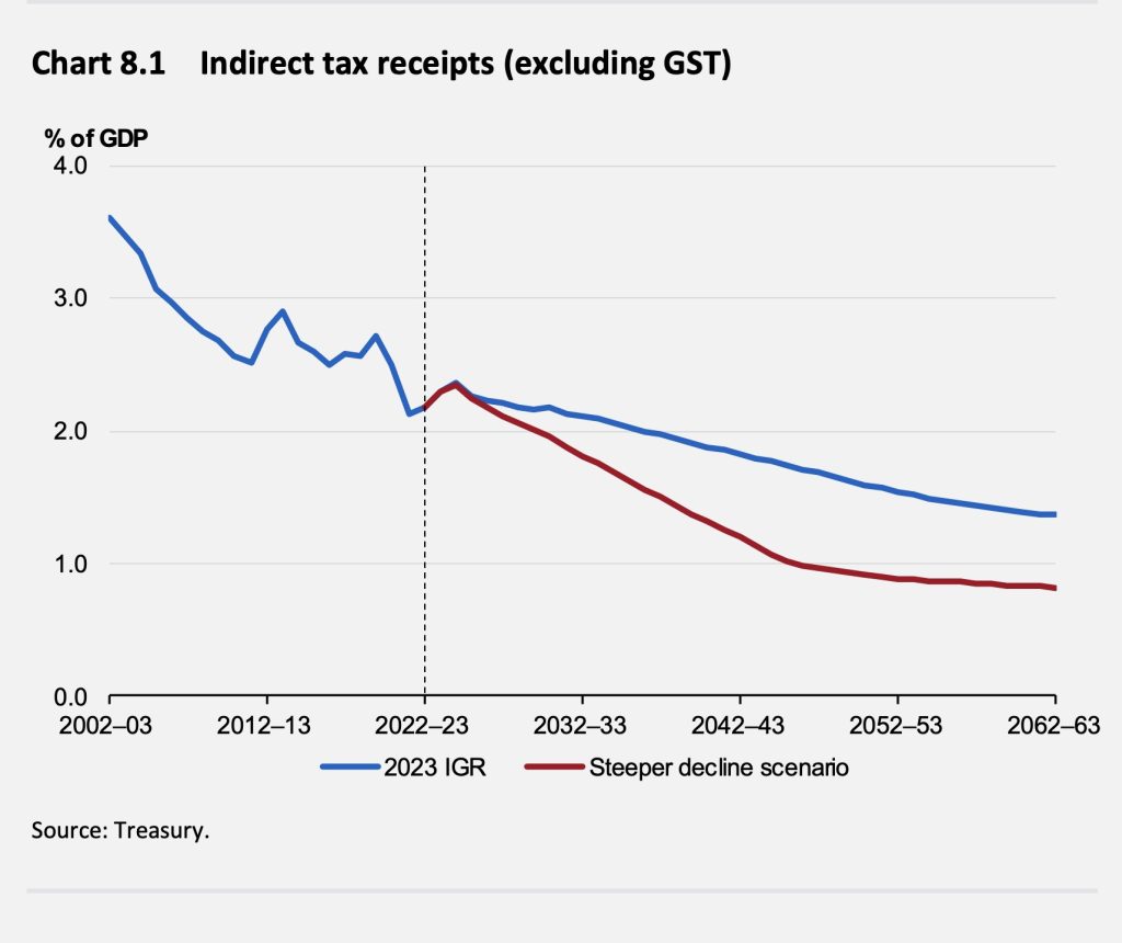 “The composition of our tax base is changing,” the Treasurer said. “The best example in the intergenerational report is obviously we will collect less fuel excises as more people take up electric vehicles.”