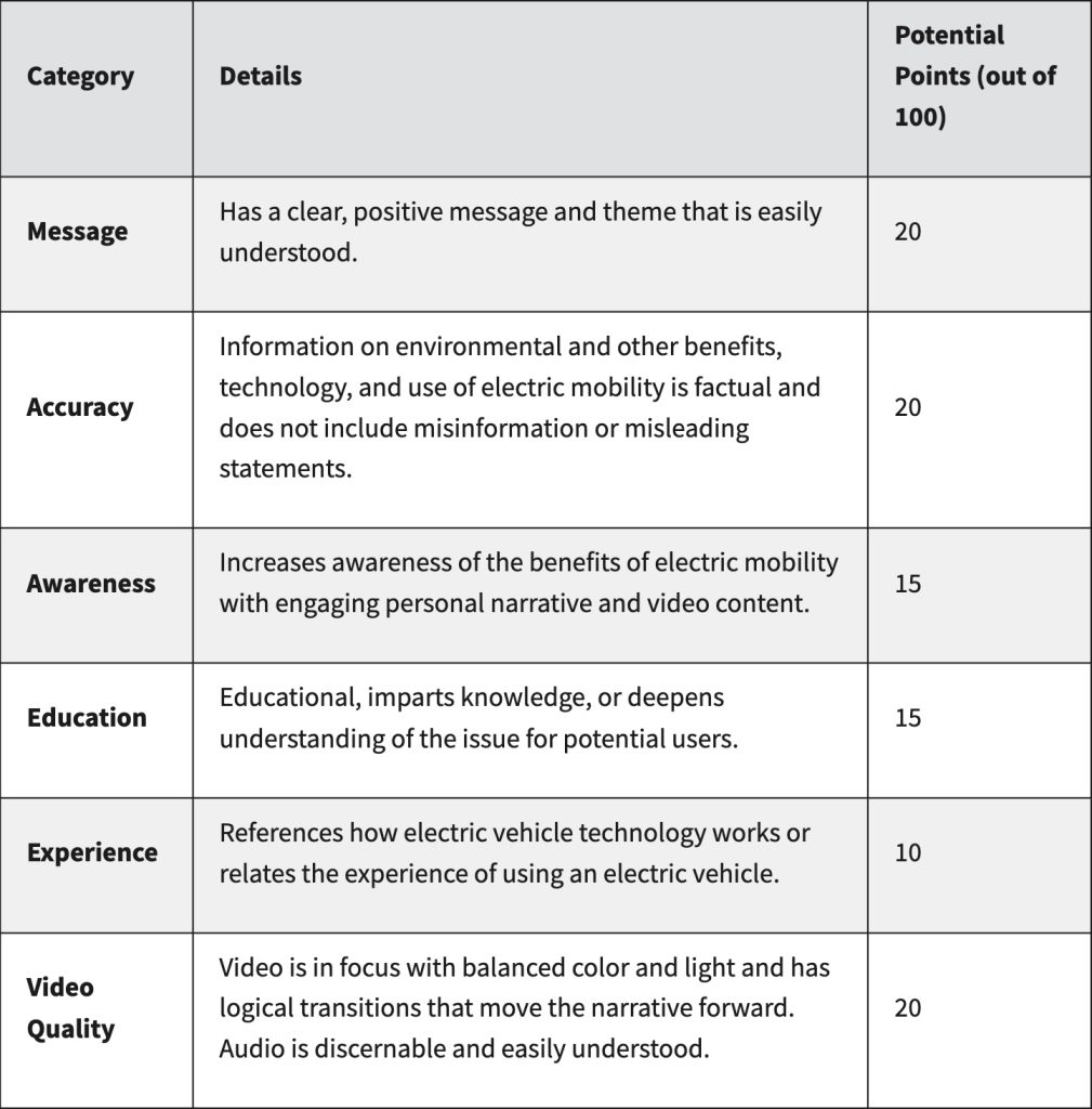 Videos should showcase real-life experiences using electric vehicles. In the 1- to 2-minute video, applicants should highlight their positive personal experience with electric mobility.