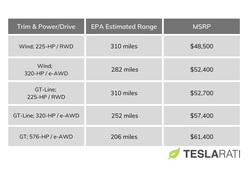 The pricing, power and drive, EPA estimated range, and MSRP for the Wind and GT EVs are below and do not include the $1,295 destination.