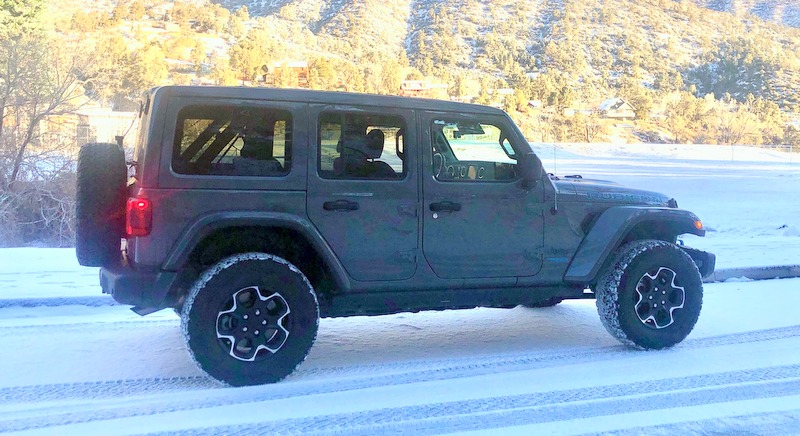 The highly optioned Wrangler Rubicon 4xe had convenience features such as a tilt and telescopic steering column, all-weather floor mats, Trailer Tow package, the Lighting Group with LED head, daytime running, fog and tail lights; power door locks, heated power exterior mirrors, automatic dual zone climate control, remote/proximity keyless entry, push button start, 12V power outlets (front and rear), AUX ports and multiple cup holders. Missing–common on SUVs in this price range–was wireless charging, heated front seats and a heated steering wheel. When I trekked into the mountains, early one morning in late December to chase some snow, those last two would have been welcome (if you live in a snowy area, you might want to opt for the $995 Cold Weather package, which includes heated seats, steering wheel and a remote start system).