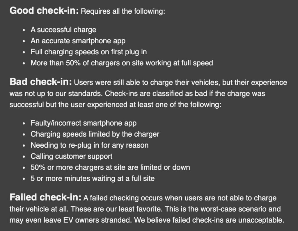 By far, the most notable statistic published by Rate Your Charge is the overall charging experience indicator, which the organization categorizes into three sections; good, bad, and failed. The Rate Your Charge website lists the numerous qualifications that must be met to achieve a good charge rating and what will be categorized as “bad” or “failed.”